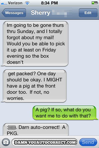 The response is even funnier than the initial text. She actually believes there is a possibility that her neighbor has a pig guarding her front door.