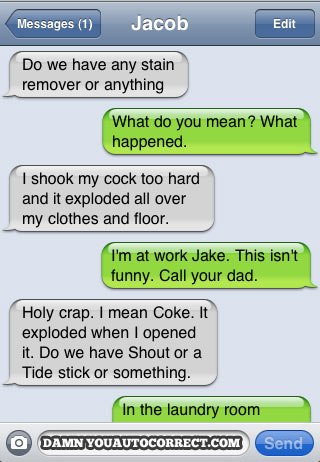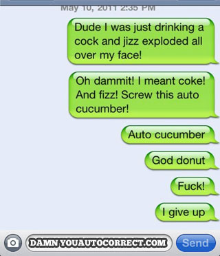 This is probably the best example of how useless the autocorrect feature is. Auto cucumber? God donut? When would someone EVER need to use those phrases? It seems like the iPhone also coined a new term for a blowjob – “drinking a willy.”