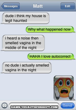 Technically this isn’t an autocorrect fail, but it’s still pretty funny. I’m not sure what the connection is between a haunted house and smelling vagina though.